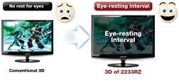Comfortable 3D image for eyes realized through ergonomics technology. Provides the 'eye-resting interval'. One of the most comfortable 3D displays for eyes out of all the present 3D display devices.